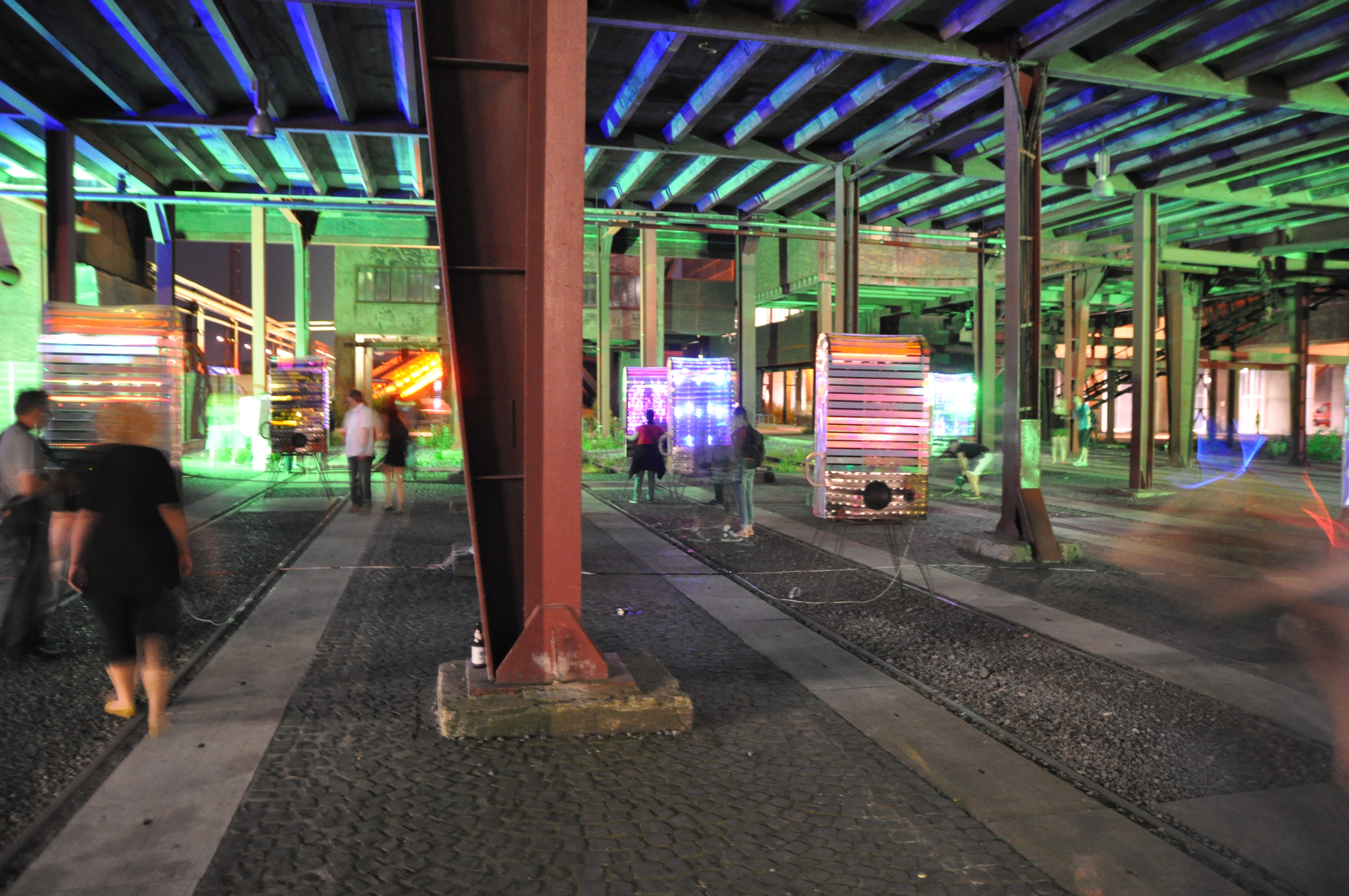 Each of the ten sculptures generates its own specifik sound and light. Simply by rotating the full object the interactor can change the sound being generated. The whole orchestra together form a noisy, chaotic coincidental futuristic reactivation in sound a light of the factory terrains. Users don’t need any musical background to be a sound generating part of the orchestra, this way anyone can play and generate.