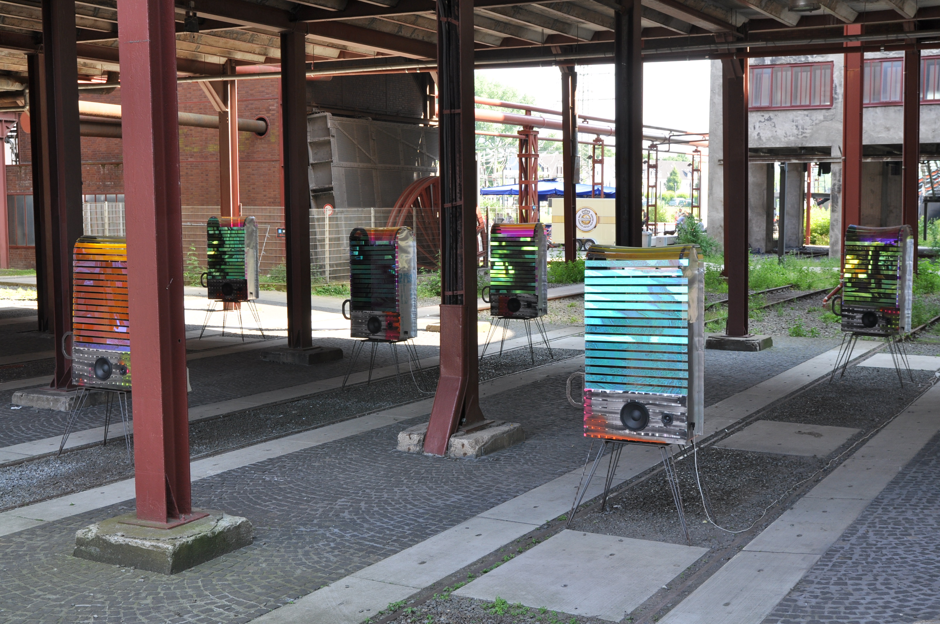 Interactive installation containing 7 sculptures specially created for the Industriada festival in Poland at the Guido coal Mine museum in Zabrze, and the Extraschicht festival in Germany at the Zollverein coalmine in Essen. The installation focusses on a reactivation of the previously so active surroundings and terains of both factories. Nowadays in use as a museum and a place to organize concerts and other events. Before a hars place full of nioise, mechanic movements, blinking lights and coincidental smoke. In a way the rotative interaction reminds of the rotating mechanizm used in colamines for moving the elevator.